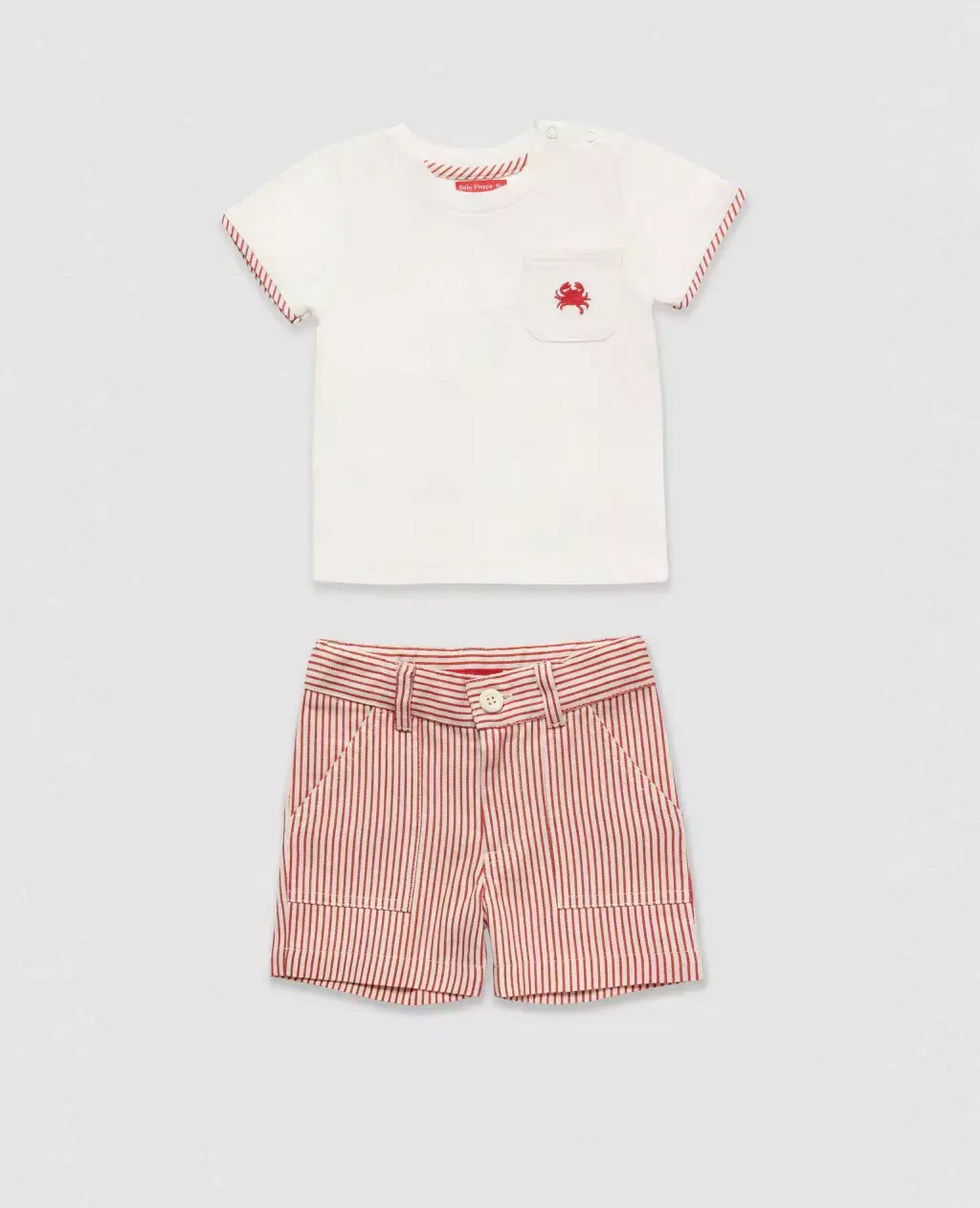 Conjunto compuesto por remera confeccionada en jersey gamuzado 100% algodón, que ofrece un tacto suave y agradable en contacto con la piel. Su diseño se realza con delicados detalles marineros y un bordado exclusivo en el frente.